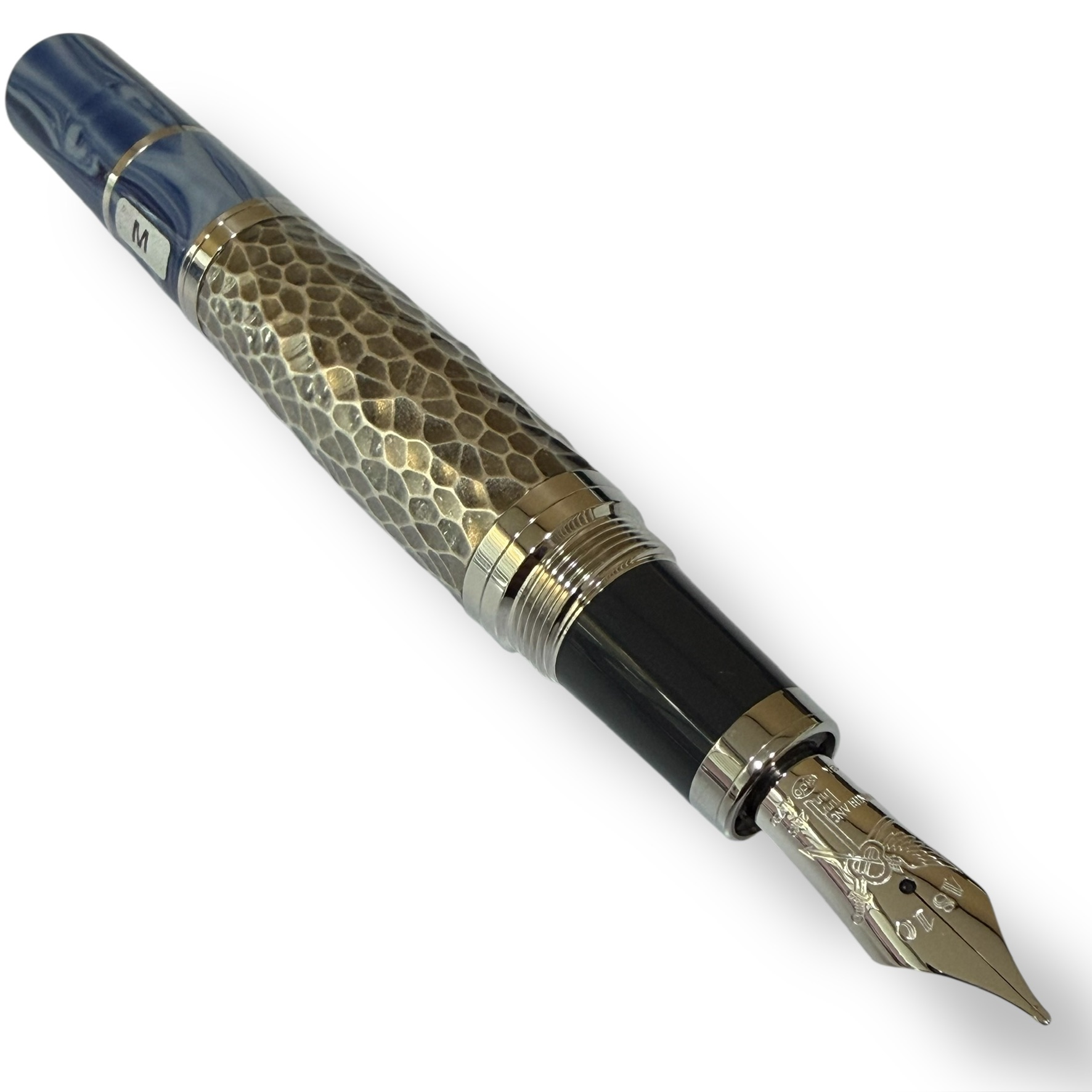 The technical execution of the pen is a sophisticated study in symbolic storytelling. The barrel is crafted from silver-plated metal, uniquely hammered to provide a rugged, tactile surface that honours the manual labour Tolstoy championed at his estate, Yasnaya Polyana. This sits in deliberate contrast to the dark blue precious resin of the cap and the marble-grey resin of the cone: colours that evoke the stoic Russian winters and the modest bindings of his personal library. The cap is further distinguished by the refined engraving of Tolstoy’s own signature, a hallmark of the Writers Edition series that serves as a personal seal of authenticity.
